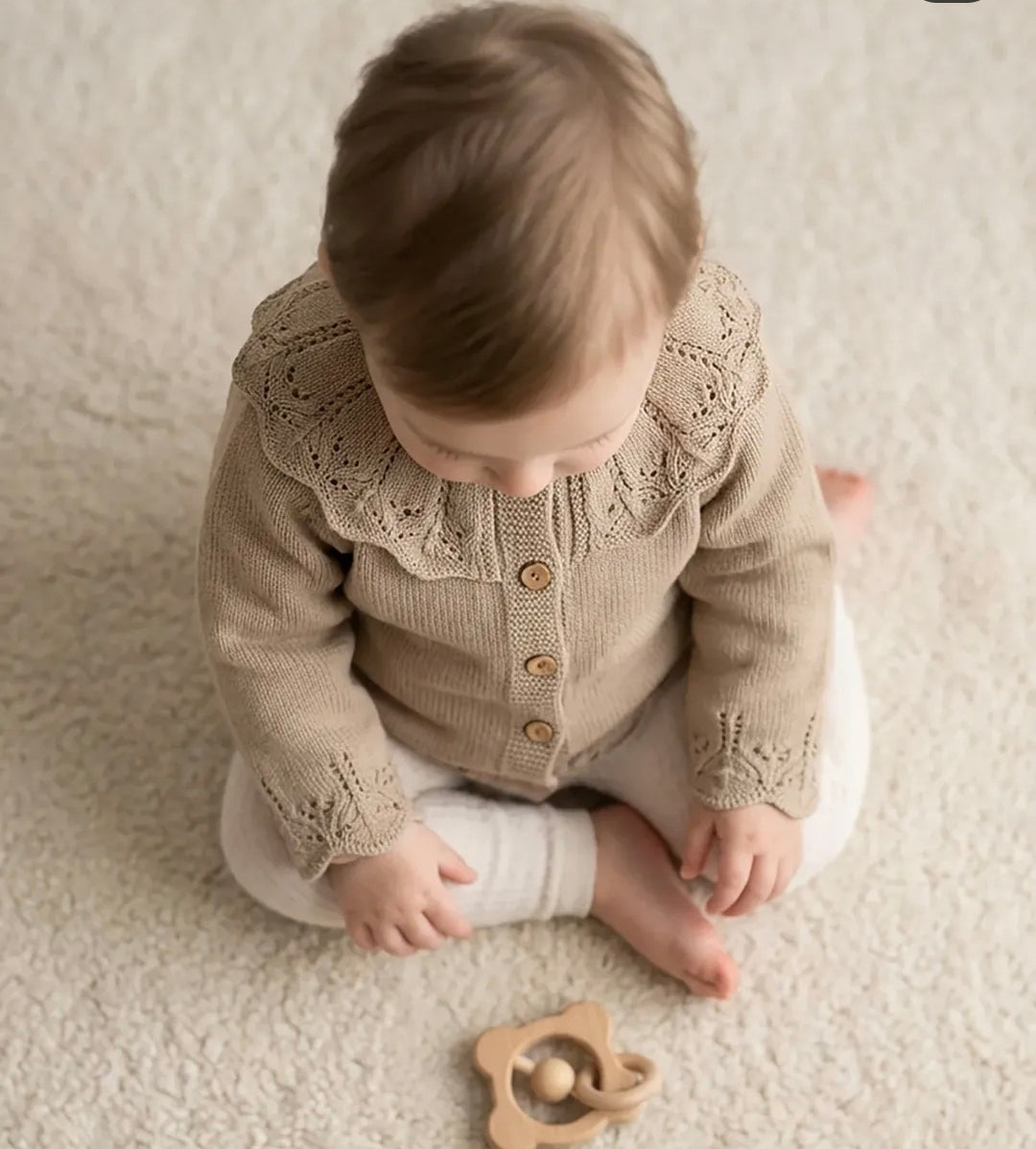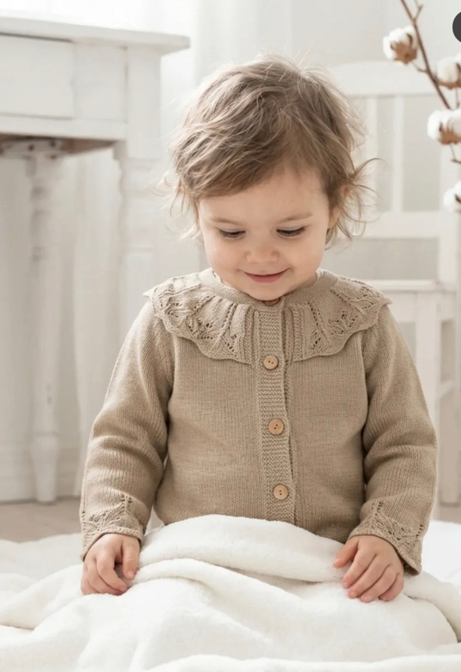 Strickjacke für Kinder mit hübschem Strickkragen aus Spitze.