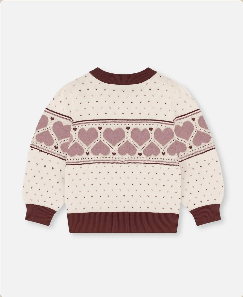 Langärmliger Pullover mit Herzmuster. Der Pullover besticht durch drei harmonisch aufeinander abgestimmte Farben, die ein wunderschönes Jacquardmuster ergeben. Er hat einen Rundhalsausschnitt, kontrastierende Rippbündchen und eine lockere Passform.