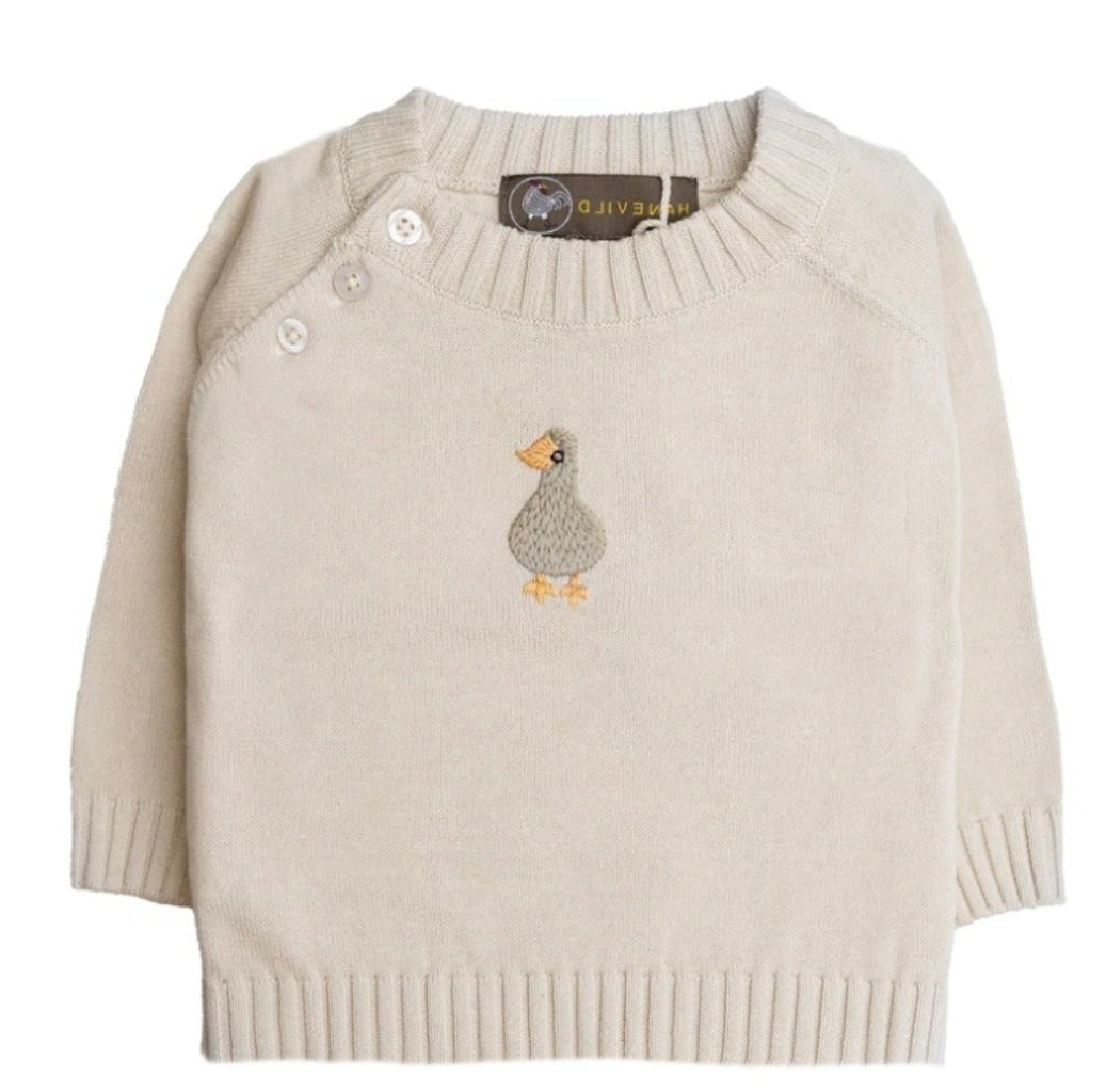 Diese weiche, gestrickte Babybluse von Hanevild aus 100 % Bio-Baumwolle in einem warmen Beigeton besticht durch ein niedliches, handgesticktes Gänsemotiv auf der Brust, das dem schlichten Design eine verspielte Note verleiht. Rippbündchen an Hals, Ärmeln und Saum sorgen für eine optimale Passform und hohen Tragekomfort. Drei feine Zugknöpfe an der Schulter erleichtern das An- und Ausziehen. Perfekt für jeden Tag.