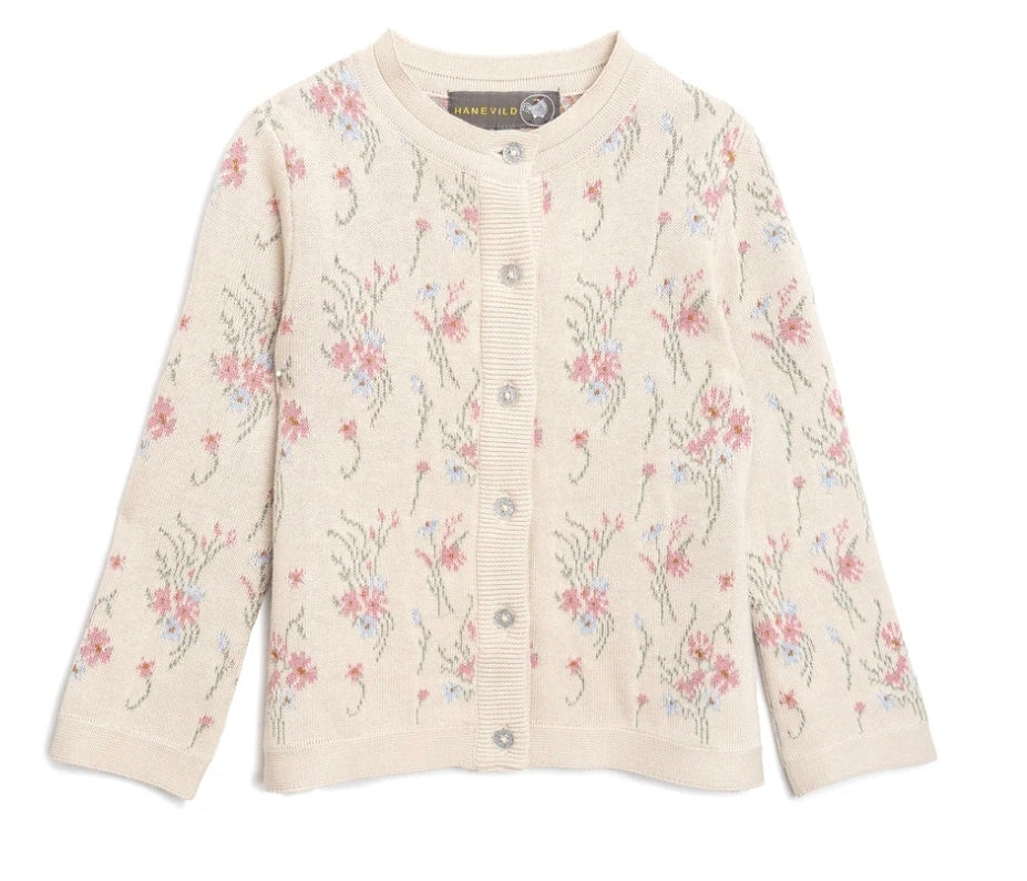 Diese wunderschöne Strickjacke von Hanevild für Kinder ist aus 100 % Bio-Baumwolle gefertigt. Sie hat eine helle, natürliche Grundfarbe und ist mit einem romantischen Blumenmuster in zarten Rosa-, Blau- und Grüntönen verziert. Die Strickjacke hat einen Rundhalsausschnitt und wird vorne mit Glitzerknöpfen geschlossen. Gerippte Bündchen an Hals, Ärmeln und Saum sorgen für eine bequeme Passform und eine schöne Optik. Ein perfekter Pullover für Alltag und besondere Anlässe – weich und mit Sorgfalt gefertigt.